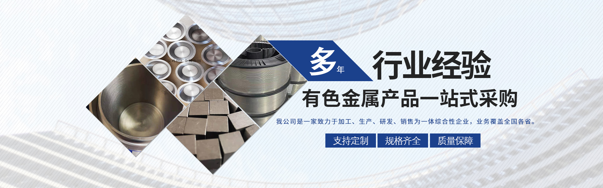 寶雞市創(chuàng)匯金屬材料有限公司,位于有“中國(guó)鈦谷”之稱(chēng)寶雞寶鈦路南段,這里也是國(guó)家重點(diǎn)支持和扶持的有色金屬材料資源產(chǎn)業(yè)基地,我司專(zhuān)業(yè)從事鈦、鋯、鉿、鎳鉻、鎢鉬、鉭鈮、合金材料、復(fù)合材料,板、棒、絲、管、箔材等,設(shè)備制造,金屬制品機(jī)械加工銷(xiāo)售。